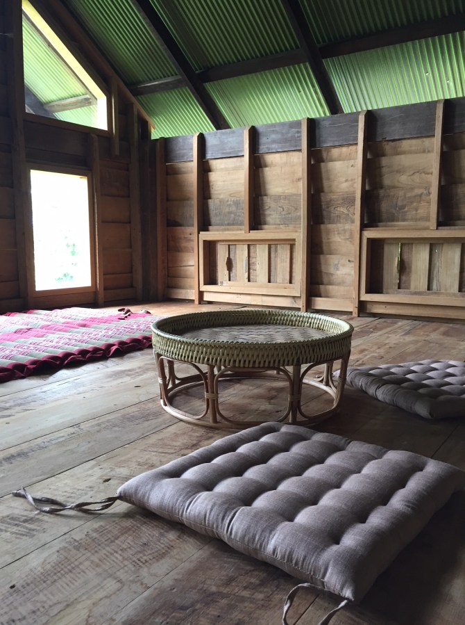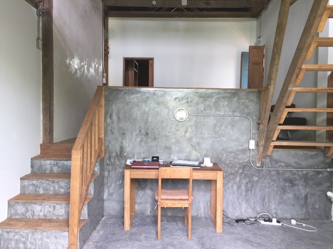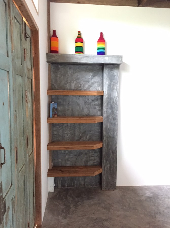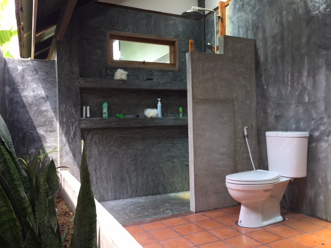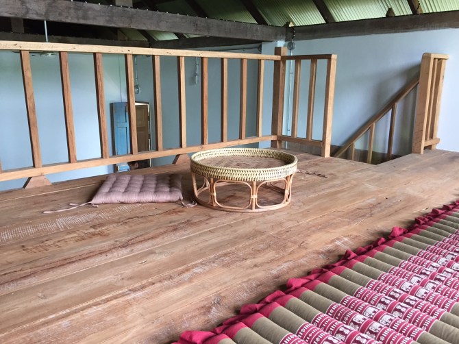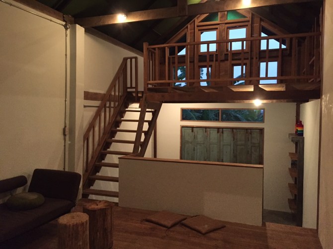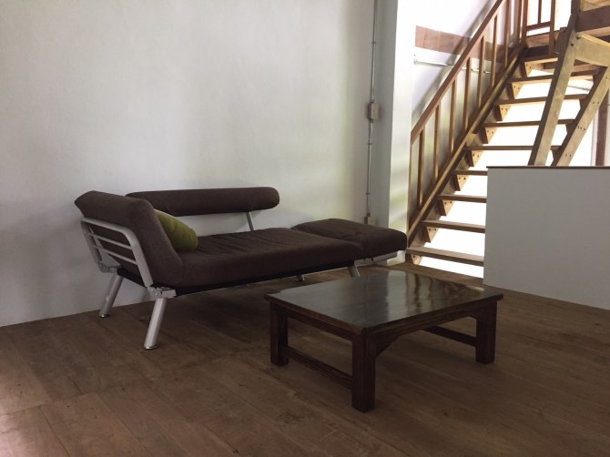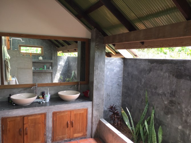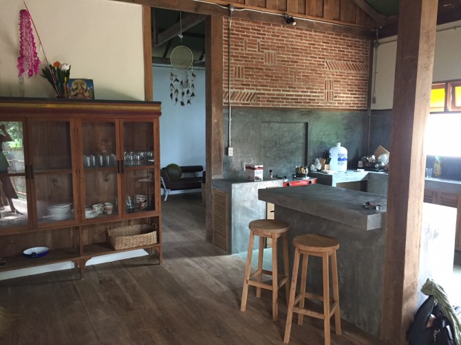 The house has split levels but is mostly spread across the ground floor. There are two bathrooms – one as an on-suite for the master bedroom and includes a modern bath tub, while the other has a rain shower and serves the main living area and the second bedroom. There is a very naturally bright reading room up on another level, which can be used as a meditation space, or a kids playroom. The entrance to the house takes you into a stunning open-plan living room/kitchen (fully equipped and well designed), where there is also a counter bar for breakfast and welcoming guests. Then there is a balcony that looks out over the beautiful gardens surrounding this magical home 🙂