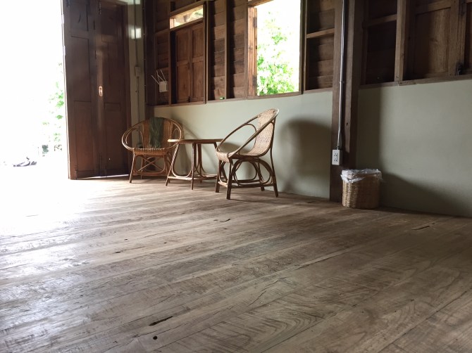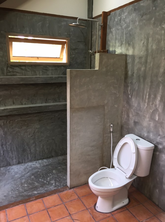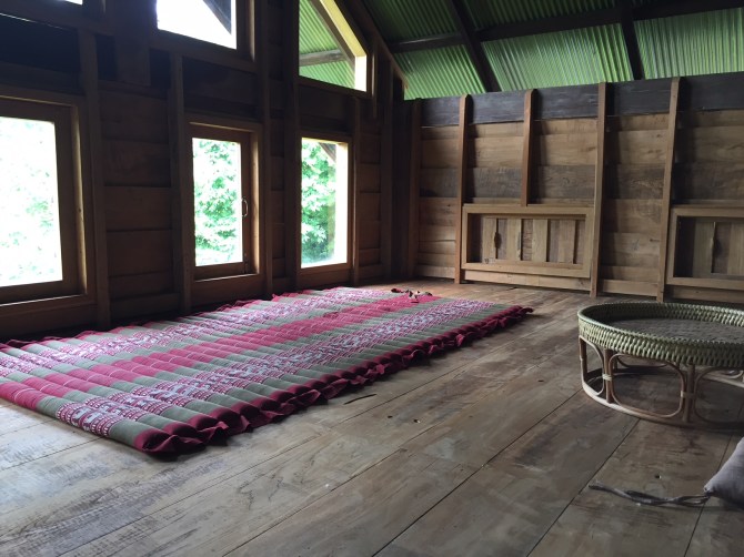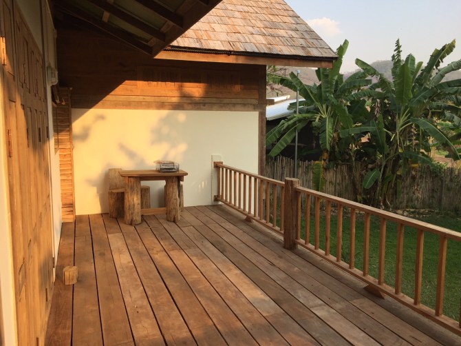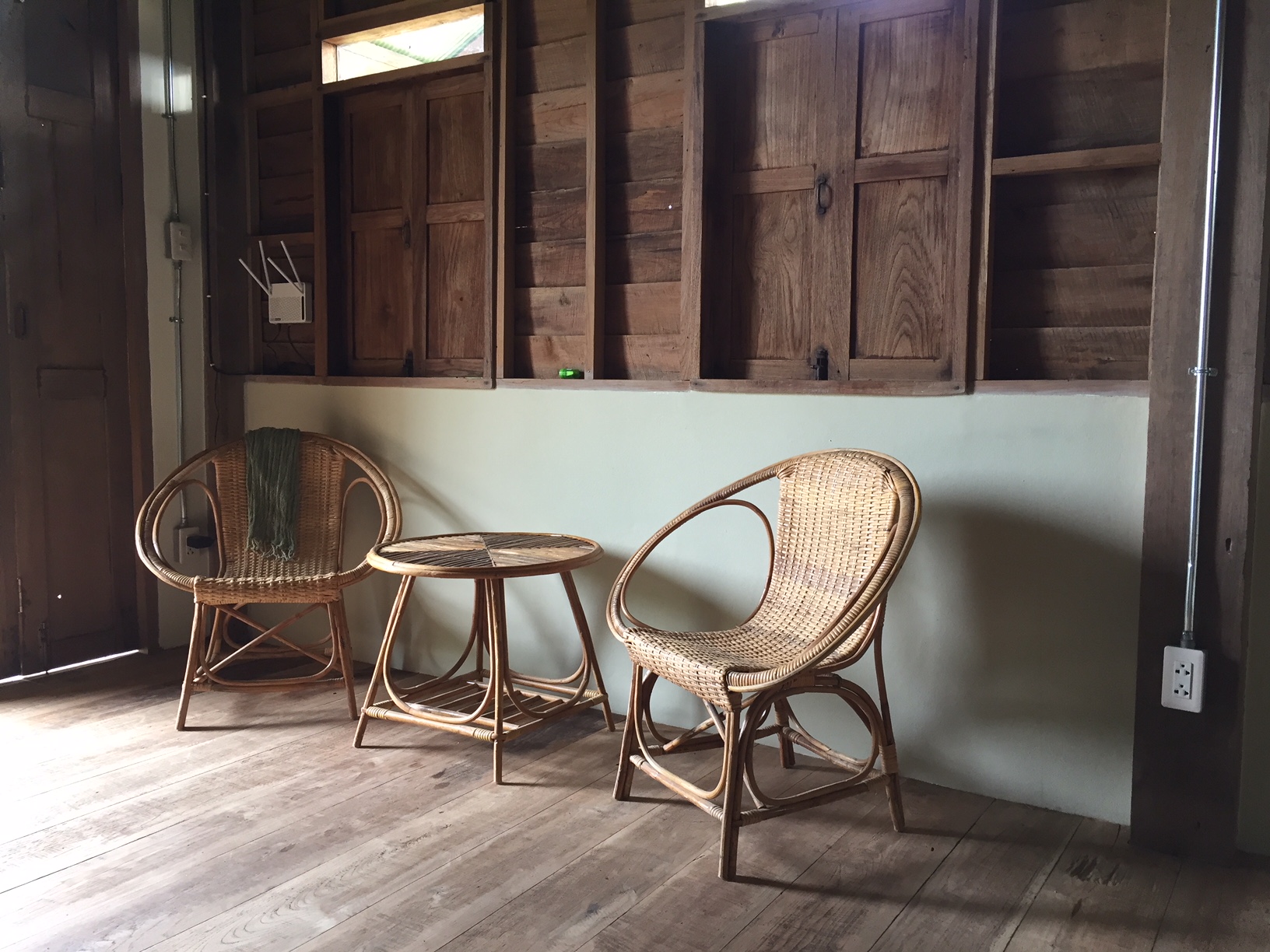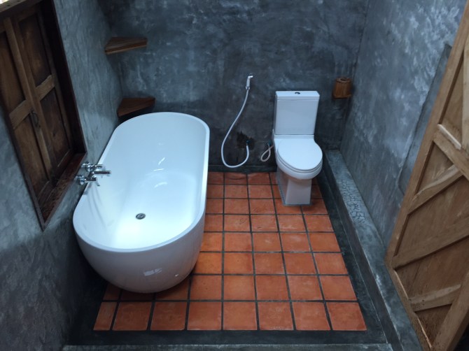 The house has split levels but is mostly spread across the ground floor. There are two bathrooms – one as an on-suite for the master bedroom and includes a modern bath tub, while the other has a rain shower and serves the main living area and the second bedroom. There is a very naturally bright reading room up on another level, which can be used as a meditation space, or a kids playroom. The entrance to the house takes you into a stunning open-plan living room/kitchen (fully equipped and well designed), where there is also a counter bar for breakfast and welcoming guests. Then there is a balcony that looks out over the beautiful gardens surrounding this magical home 🙂