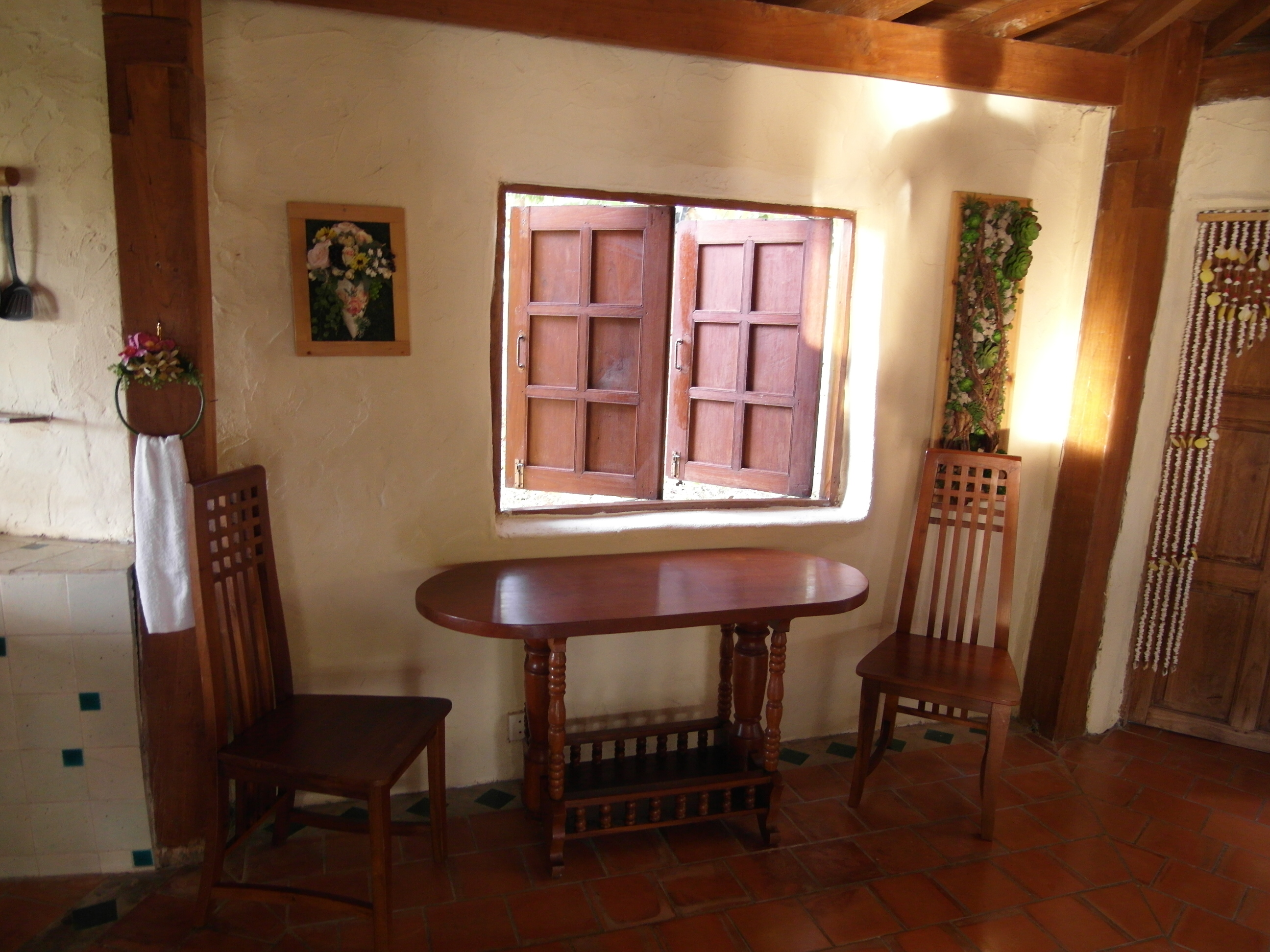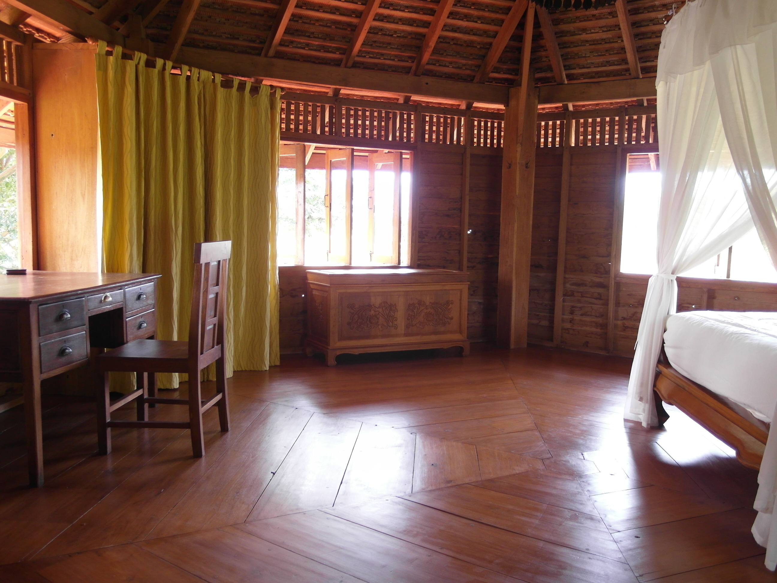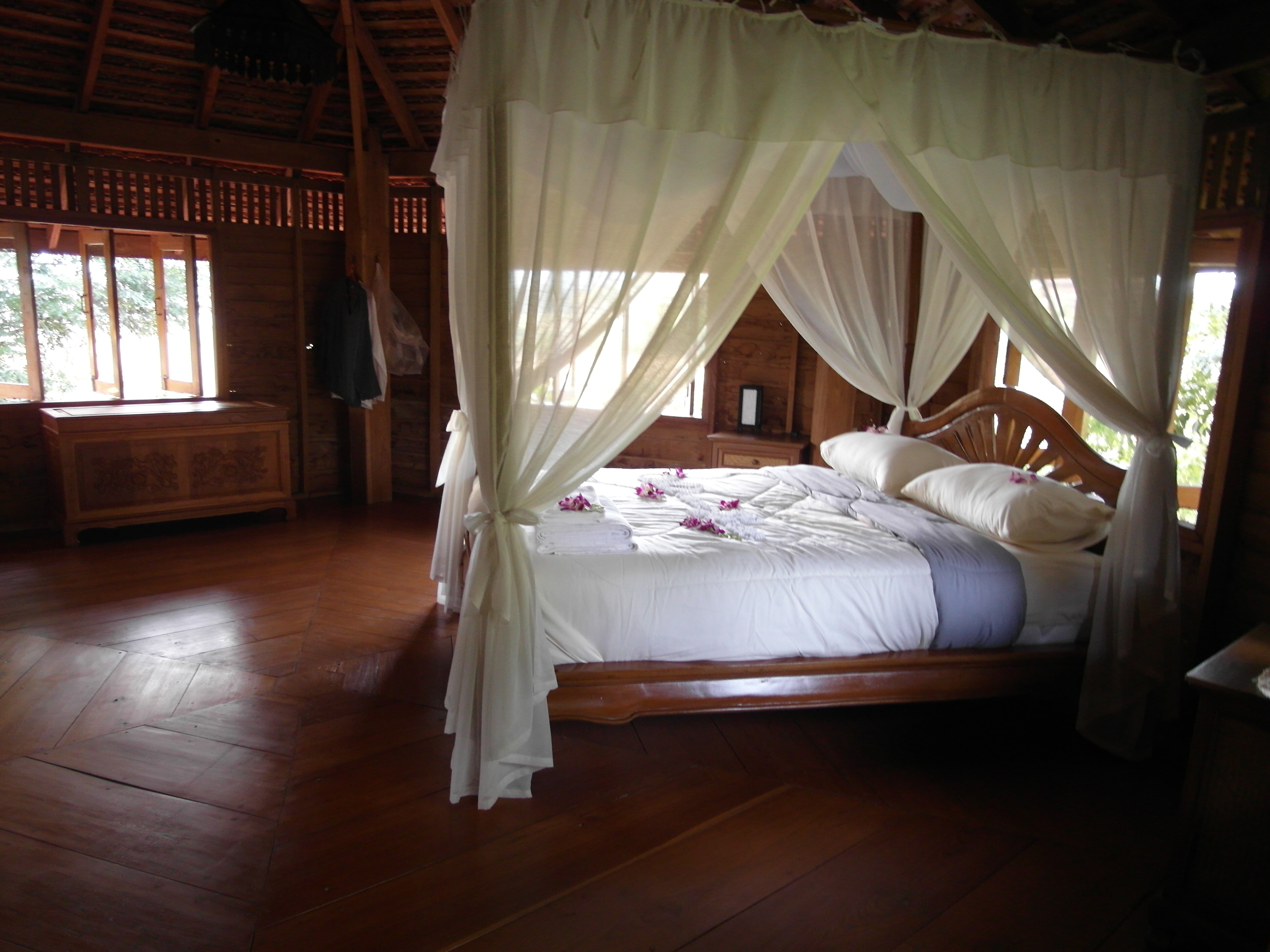 The upstairs is all teak wood consisting of 1 very large bedroom with built in wardrobe and four poster queen size teak bed. Lots of floor space for yoga or meditation.