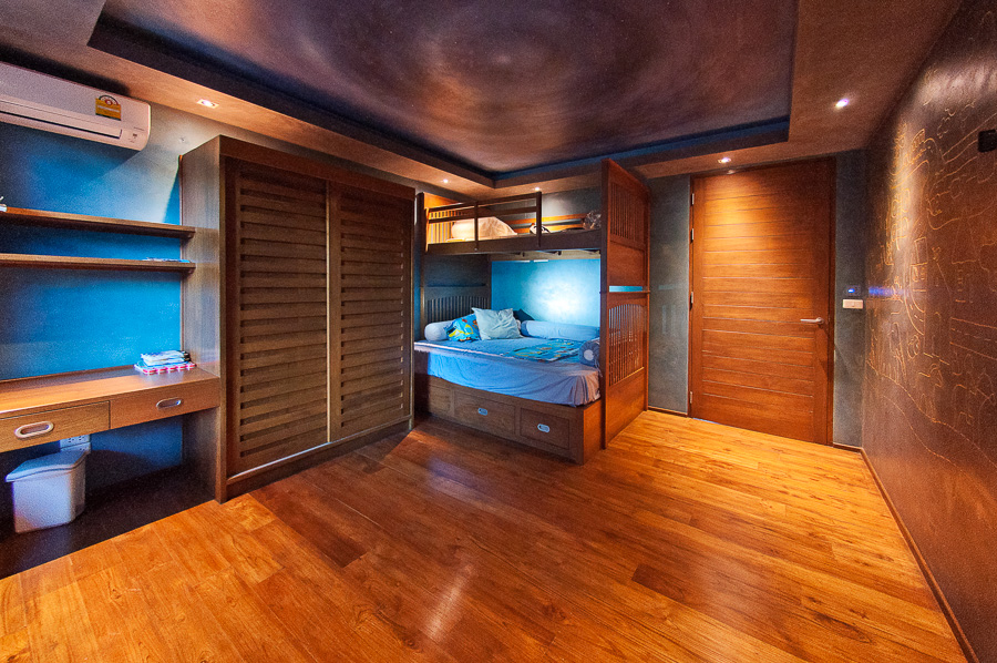 The incredible children’s room with bunk beds and ” starry night ” lighting.